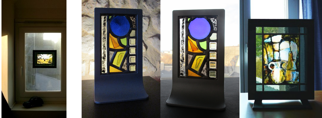 Le vitrail encadré peut être suspendu en deux points devant une baie;