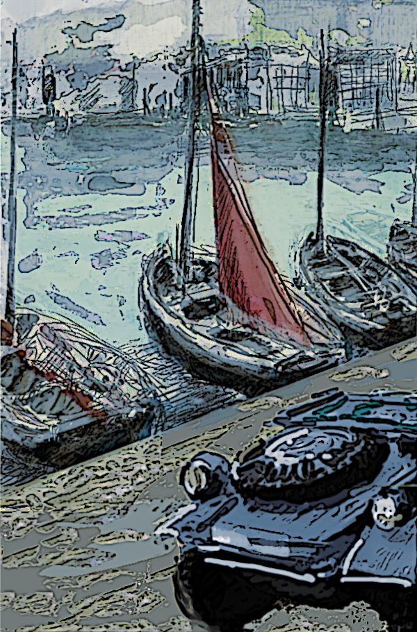 « Un long triangle rougeoyant s'appuie à la falaise, glisse sur une mer plate vert de gris, et file, très mince, vers l'horizon. »